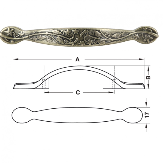 Khoảng cách A: 144 mm Dim. B: 24.0 mm Dim. C: 76 mm Bề mặt: Màu đồng thau cổ Chất liệu: Hợp kim kẽm Dim. (A x B x C): 144 x 24 x 76 mm Hole spacing: 76 mm