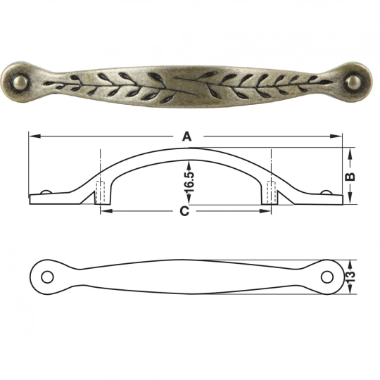 Khoảng cách A: 117 mm Dim. B: 24.0 mm Dim. C: 64 mm Bề mặt: Màu đồng thau cổ Chất liệu: Hợp kim kẽm Dim. (A x B x C): 117 x 24 x 64 mm Hole spacing: 64 mm