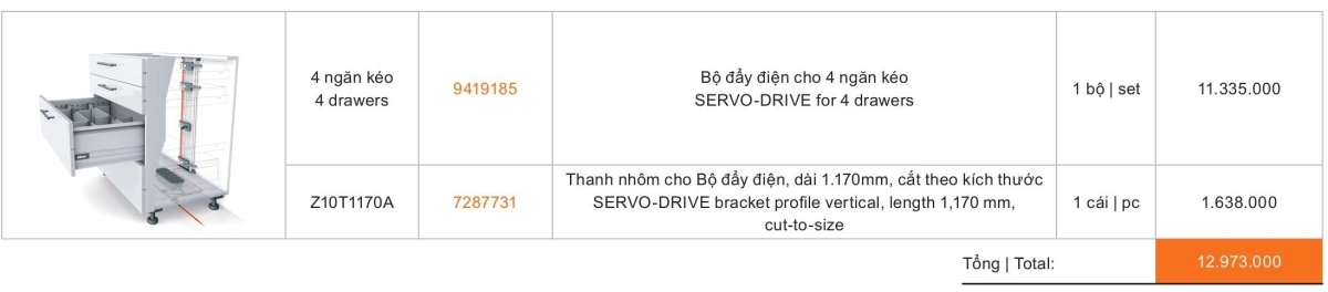 Khi đặt mua SERVO-DRIVE cho ngăn kéo cần có những bộ phận sau: