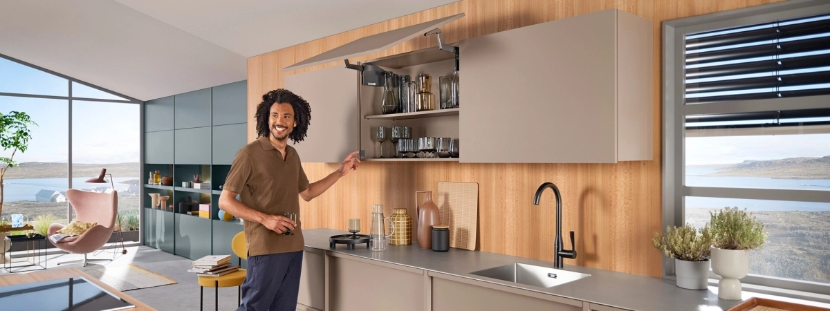 Hệ thống tay nâng AVENTOS HS top tạo ra cảm giác ấn tượng ngay lần đầu sử dụng. Có thể dễ dàng mở lên cánh tủ lớn và thoải mái sử dụng các vật dụng lưu trữ bên trong.