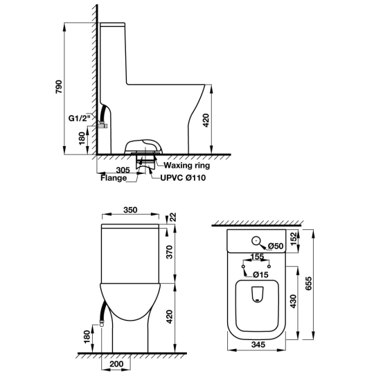 | Két nước 3/6 lít, nút xả kép nằm ở trên | |