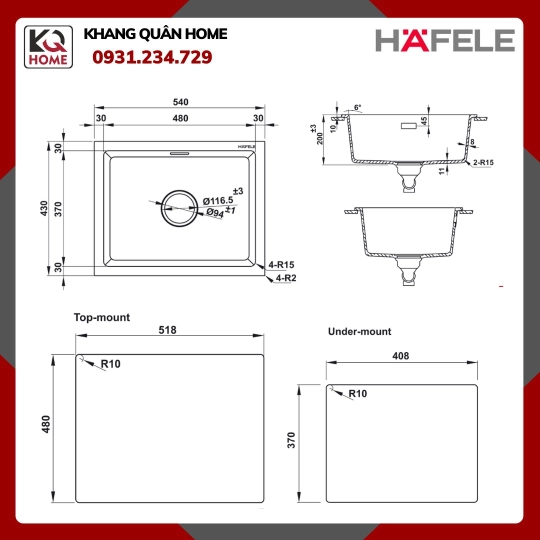 + Lắp nổi : D518 x R408mm