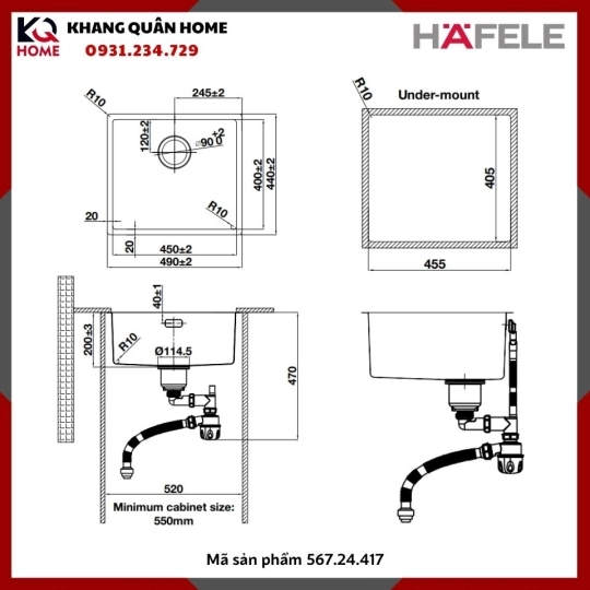 + Lắp âm: 455D x 405R mm