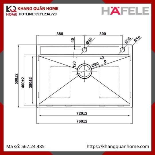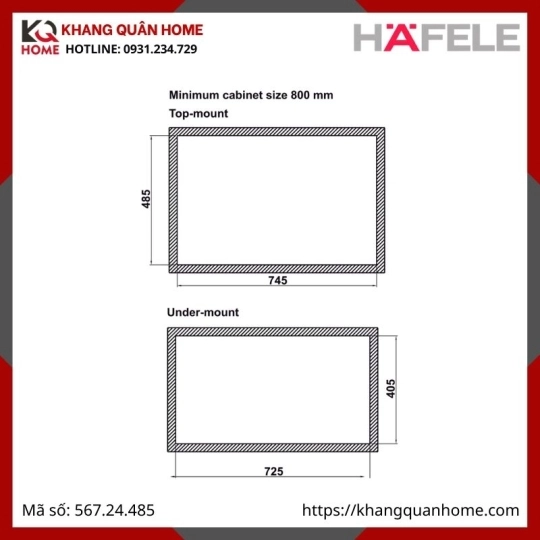- Kích thước cắt đá: Lắp nổi: 745D x 485R mm
