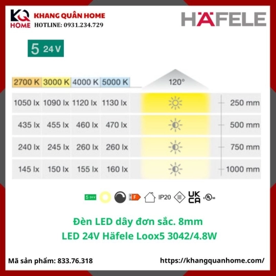 >> Hướng dẫn lắp đặt Đèn LED 24V Häfele Loox5 3042 8 mm 4000K 4,8 W/m-833.76.318- 2 chân đơn sắc, trắng mát: