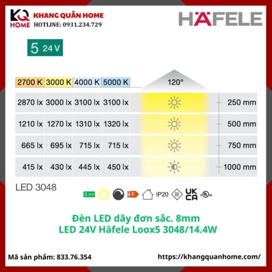 Thông tin Đèn LED 24V Häfele Loox5 3048 8 mm 4000K 14,4 W/m- 833.76.354 trắng lạnh.