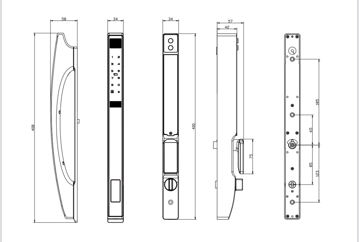 | Thông số kĩ thuật | Kích thước mặt trong/ ngoài: 42.5×430 mm Nguồn cung cấp: 6V (Pin Sạc Lithium kép) Tuổi thọ pin: Mở cửa 30.000 lần Nguồn điện khẩn cấp: 5V-1A, Micro USB Dây cáp sạc: Có Độ dày cửa: 40~80 mm Độ rộng đố cửa: >60mm |
