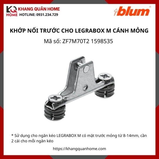 | Sử dụng cho ngăn kéo LEGRABOX M có mặt trước mỏng từ 8-14mm, cần 2 cái cho mỗi ngăn kéo | ZF7M70T2 | 1598535 | 1 cái |