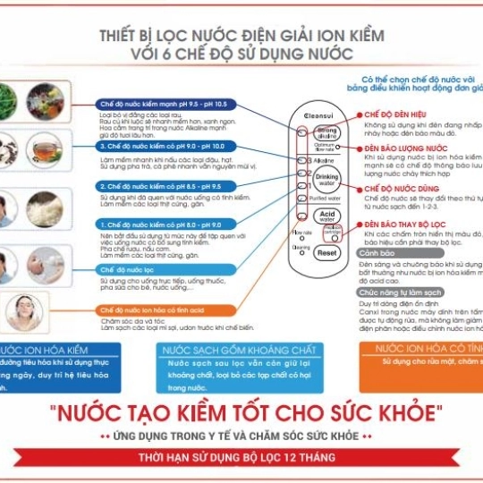 ++Lưu ý: Nước ion kiềm không dùng bất kỳ một hóa chất nào để tạo ra độ PH cao (độ kiềm cao).