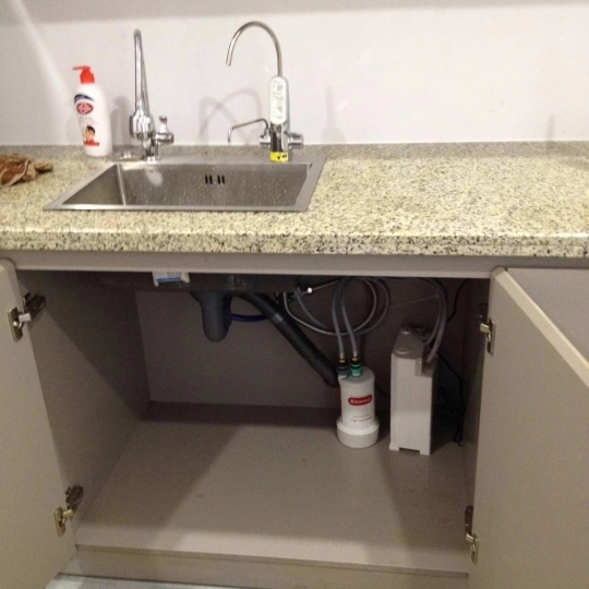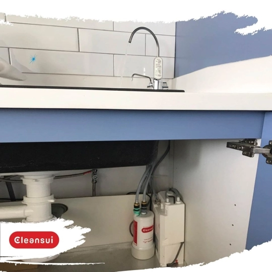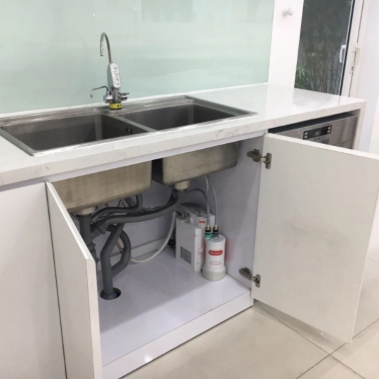 +Bước 1: Nước chưa lọc sẽ đi qua bộ lọc EUC2000 với hệ thống khép kín 4 cấp lọc. Chất lượng nước sau lọc đảm bảo an toàn để ăn uống trực tiếp được tại vòi. (CN-viện Paster HCM).