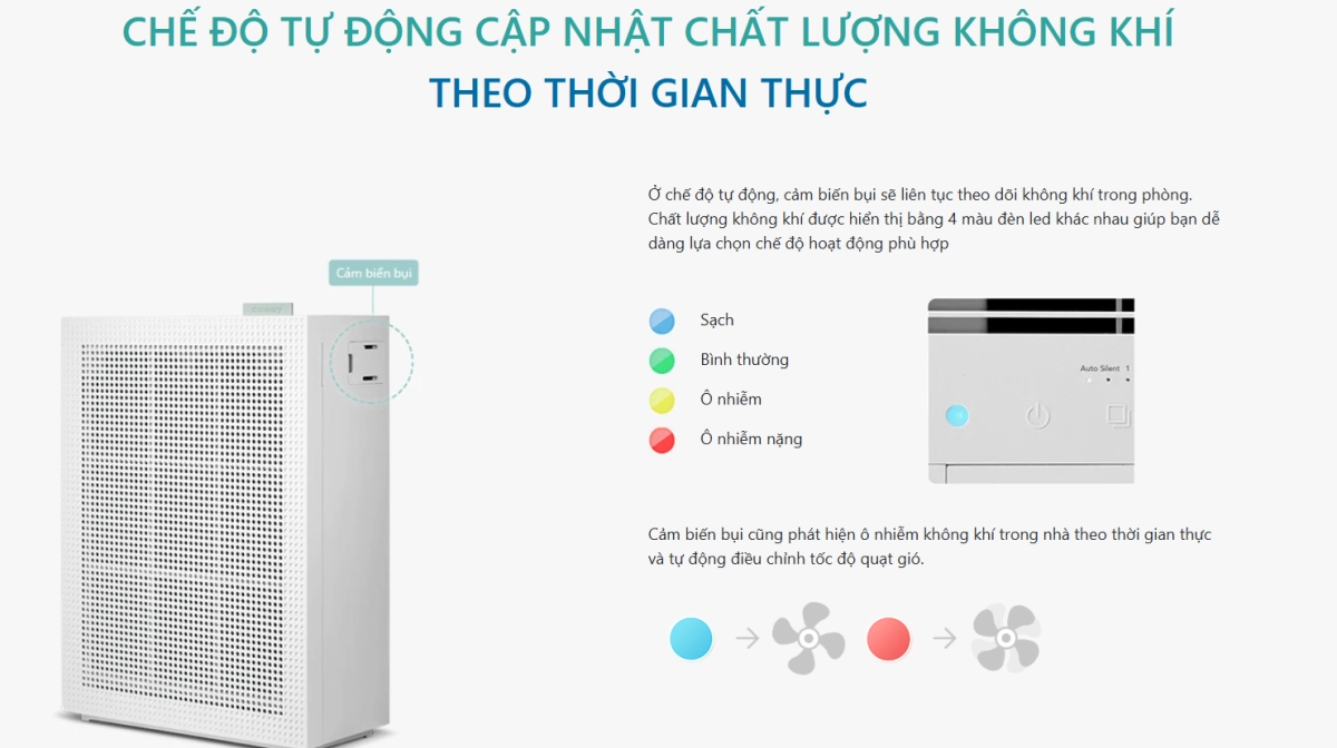 • Chế độ tự động: Máy tự điều chỉnh tốc độ quạt dựa trên chất lượng không khí đo được.