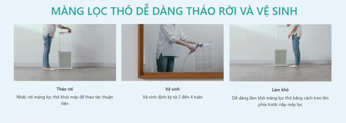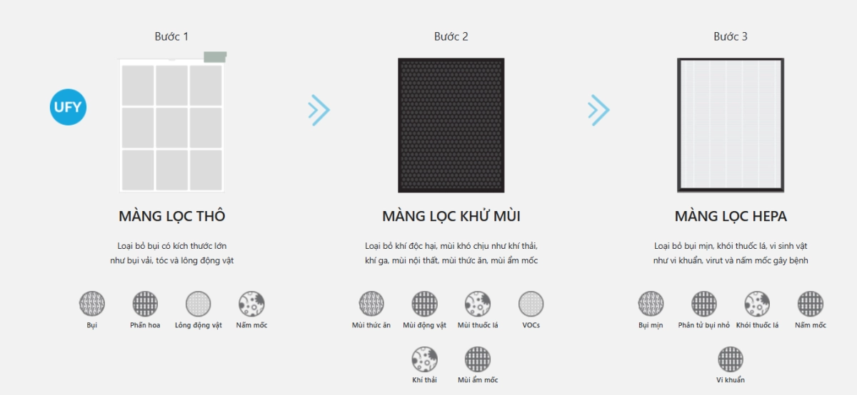 • Hệ thống lọc bụi mạnh mẽ với 3 bước lọc có khả năng làm sạch không gian với diện tích đến 33m²