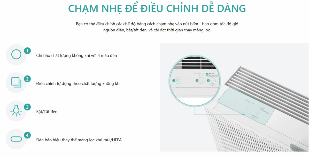 • Màn hình điều khiển thân thiện với người dùng: chỉ cần chạm nhẹ để chọn chế độ