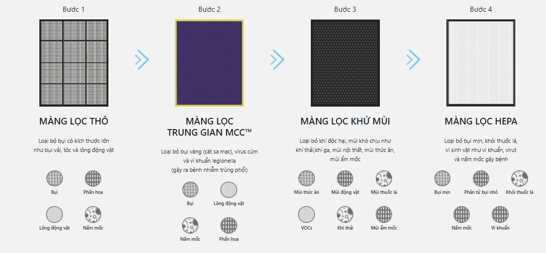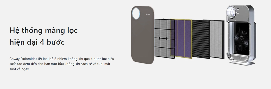 - Hệ thống màng lọc hiện đại 4 lớp loại bỏ bụi, vi khuẩn, virus hiệu quả