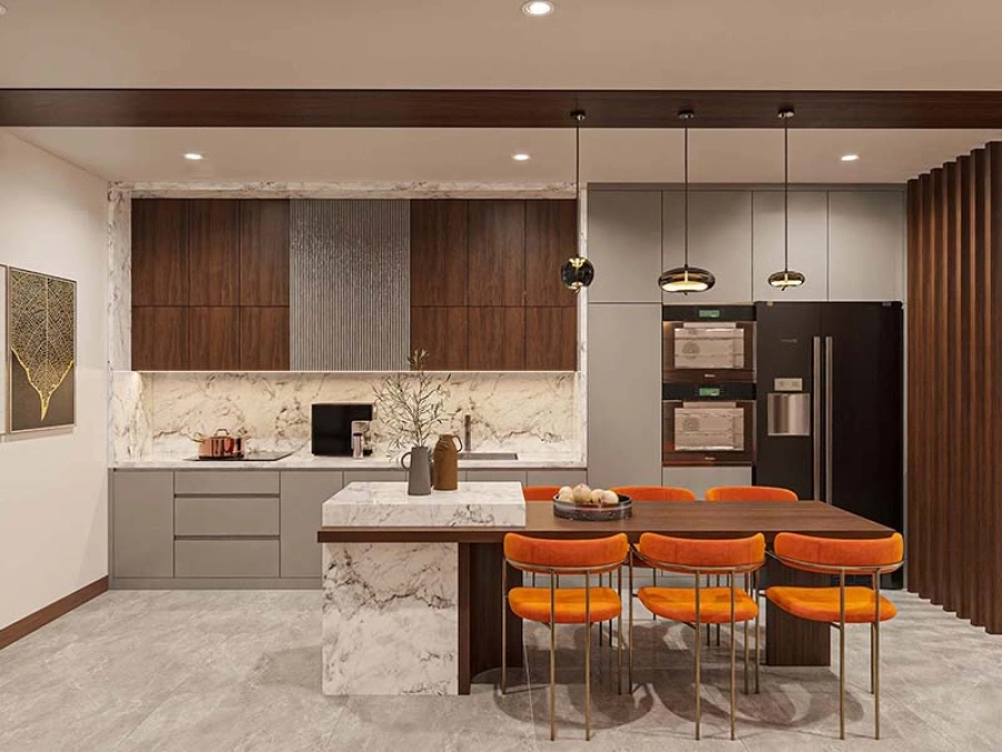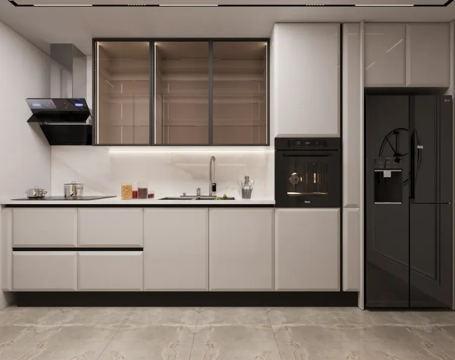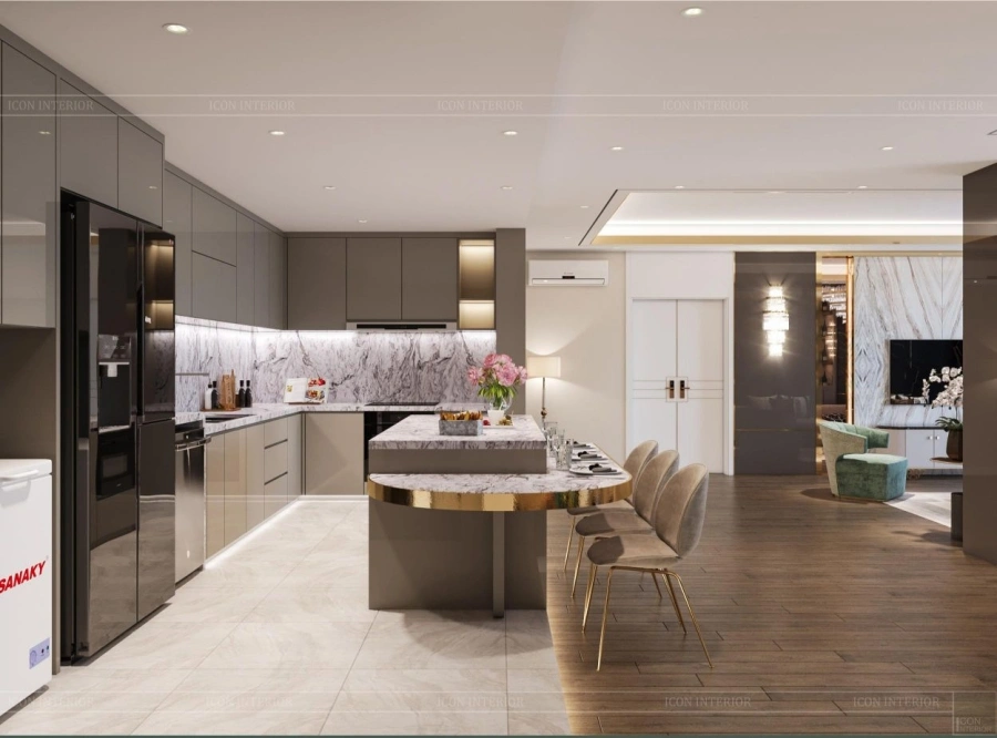 Kết hợp tủ bếp hiện đại với tay nắm kim loại và bản lề cao cấp giúp không gian vừa đẹp vừa bền.
